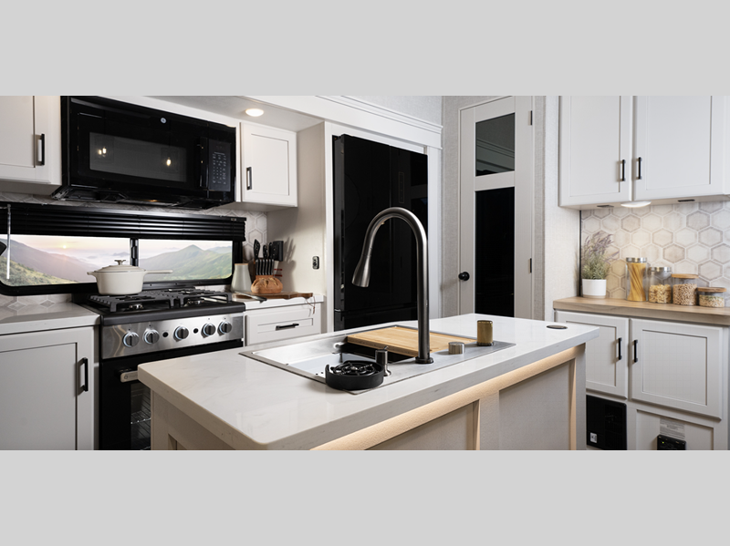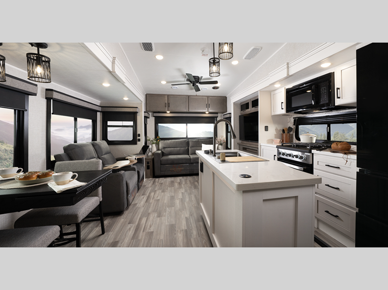 Sleeps 4 Slides 3 Length 36 ft 8 in Ext Width 8 ft 1 in Ext Height 13 ft 4 in Int Height 8 ft 7 in Interior Color Classic Farmhouse Hitch Weight 2155 lbs GVWR 12900 lbs Dry Weight 10770 lbs Cargo Capacity 2130 lbs Fresh Water Capacity 81 gals Grey Water Capacity 87 gals Black Water Capacity 50 gals Tire Size ST235/85R16E Furnace BTU 35000 btu Available Beds King Refrigerator Type 12V Refrigerator Size 16 cu ft Cooktop Burners 3 Shower Size 30" x 48" Number of Awnings 2 LP Tank Capacity 30 lbs Water Heater Type Tankless AC BTU 30000 btu TV Info LR 50" 4K Ultra HD Smart TV Awning Info 10' 6" and 17' Electric with integrated dimmable LED lights Axle Count 2 Washer/Dryer Available Yes Number of LP Tanks 2 Shower Type Standard Electrical Service 50 amp Similar Floorplans