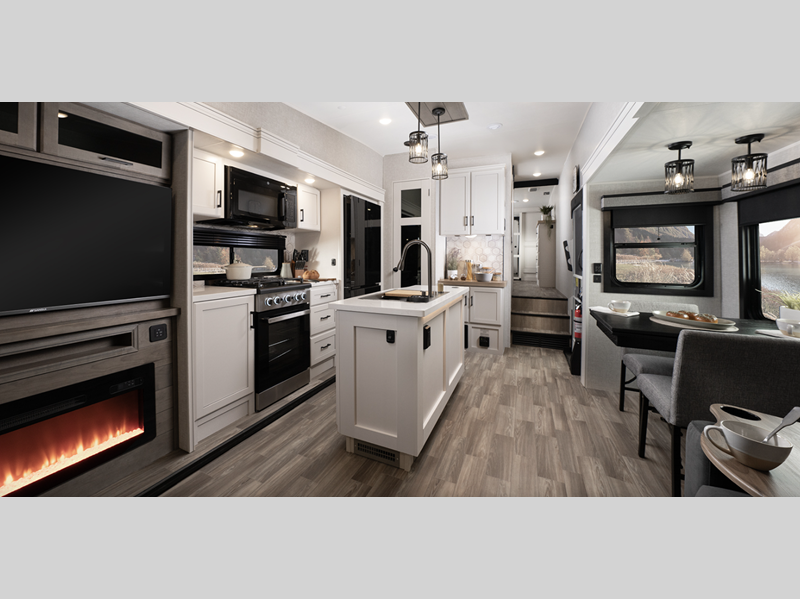 Sleeps 4 Slides 3 Length 38 ft 5 in Ext Width 8 ft 1 in Ext Height 12 ft 10 in Interior Color Classic Farmhouse Hitch Weight 2350 lbs GVWR 13800 lbs Dry Weight 11540 lbs Cargo Capacity 2260 lbs Tire Size ST235/85R16E Furnace BTU 35000 btu Available Beds King Refrigerator Type 12V Refrigerator Size 16 cu ft Cooktop Burners 3 Shower Size 30" x 48" Number of Awnings 2 LP Tank Capacity 30 lbs Water Heater Type Tankless AC BTU 30000 btu TV Info LR 50" 4K Ultra HD Smart TV Awning Info 10' 6" and 19' Electric with integrated dimmable LED lights Axle Count 2 Washer/Dryer Available Yes Number of LP Tanks 2 Shower Type Standard Electrical Service 50 amp Similar Floorplans