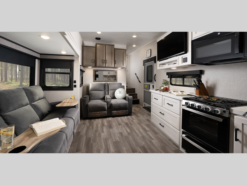 Sleeps 4 Slides 3 Length 34 ft 3 in Ext Width 8 ft 1 in Ext Height 12 ft 3 in Int Height 8 ft 5 in Interior Color Calli Linen Hitch Weight 1915 lbs GVWR 11500 lbs Dry Weight 9725 lbs Cargo Capacity 1875 lbs Fresh Water Capacity 52 gals Grey Water Capacity 45 gals Black Water Capacity 45 gals Tire Size ST225/75R15E Furnace BTU 35000 btu Available Beds Olympic Queen Refrigerator Type GE 12V Refrigerator Size 10 cu ft Cooktop Burners 3 Shower Size 30" x 36" Number of Awnings 1 LP Tank Capacity 30 lbs Water Heater Type On Demand AC BTU 15000 btu TV Info LR 4K Ultra LED HD Smart TV Awning Info 15' Electric w/Integrated LED Lights Axle Count 2 Number of LP Tanks 2 Shower Type Radius Electrical Service 50 amp Similar Floorplans