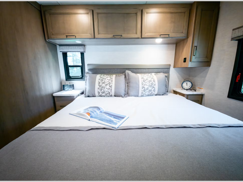 The cockpit is every pilot's dream with its 14" touchscreen dash radio with Bluetooth, backup and side view cameras, plus reclining and swivel Leatherette captain's chairs. The interior of the A.C.E is designed to make you feel at home with flat panel cabinets, spacious living quarters, and convenient kitchens that include everything you need while you're on the road.